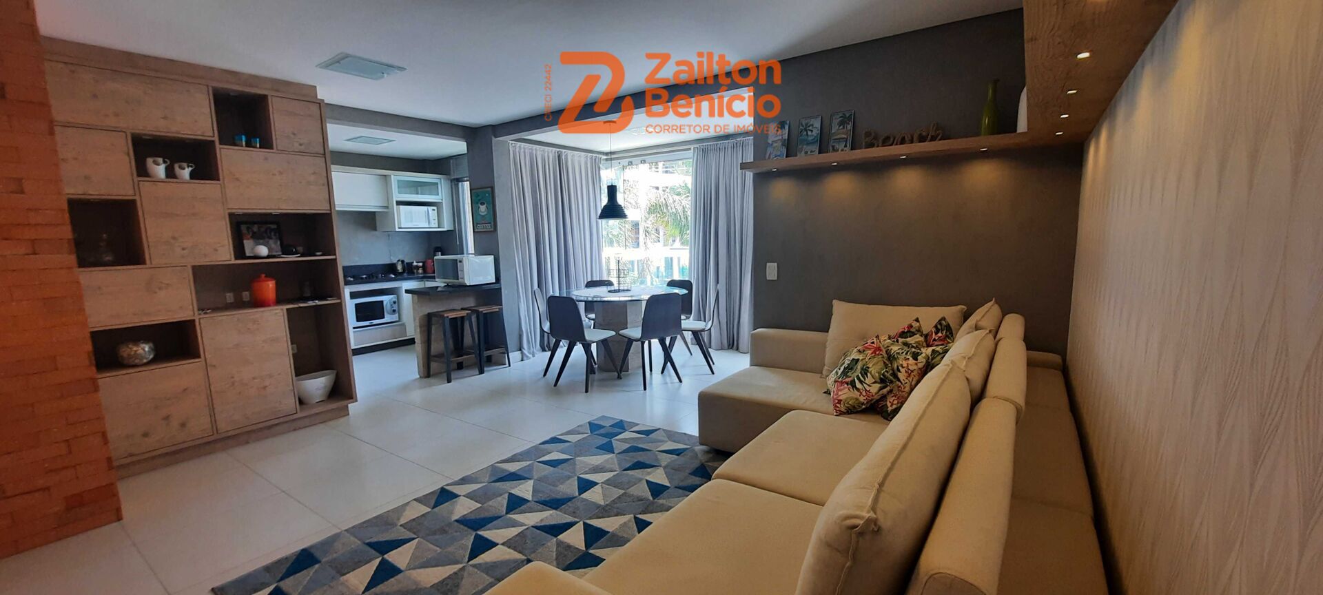 Ampla sala com tv, ar condicionado, integrada com a área de churrasqueira, sacada fechada em reiki.